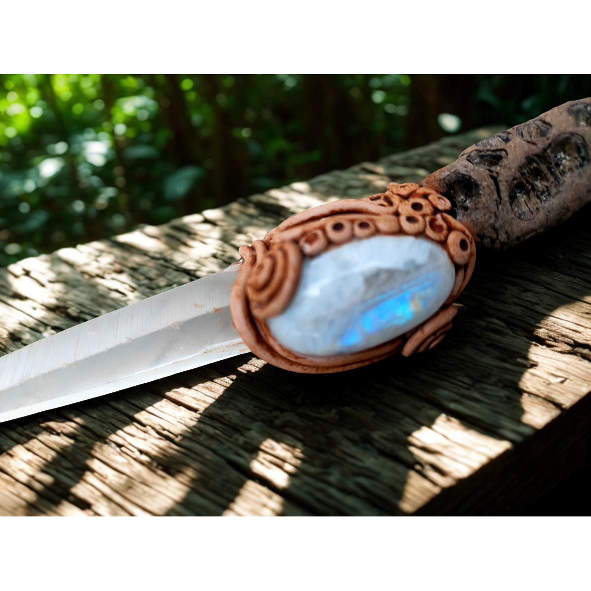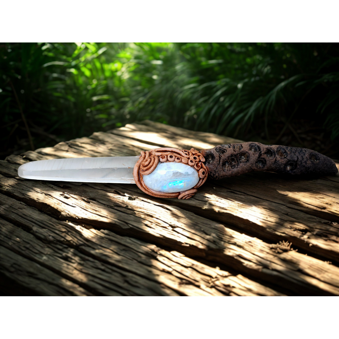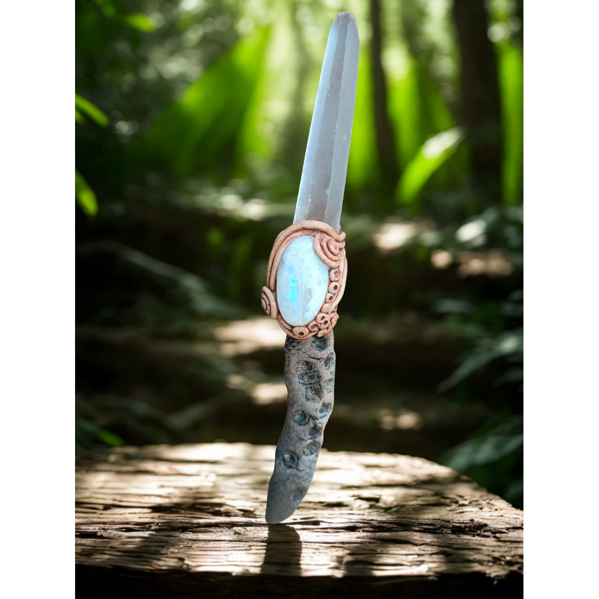 This hand-crafted wand unites two powerful allies: a Lemurian Seed Crystal and a glowing Rainbow Moonstone , a handle of wood that carries the energy of the Earth. Both tool and talisman, acting as a bridge between the seen and unseen worlds.