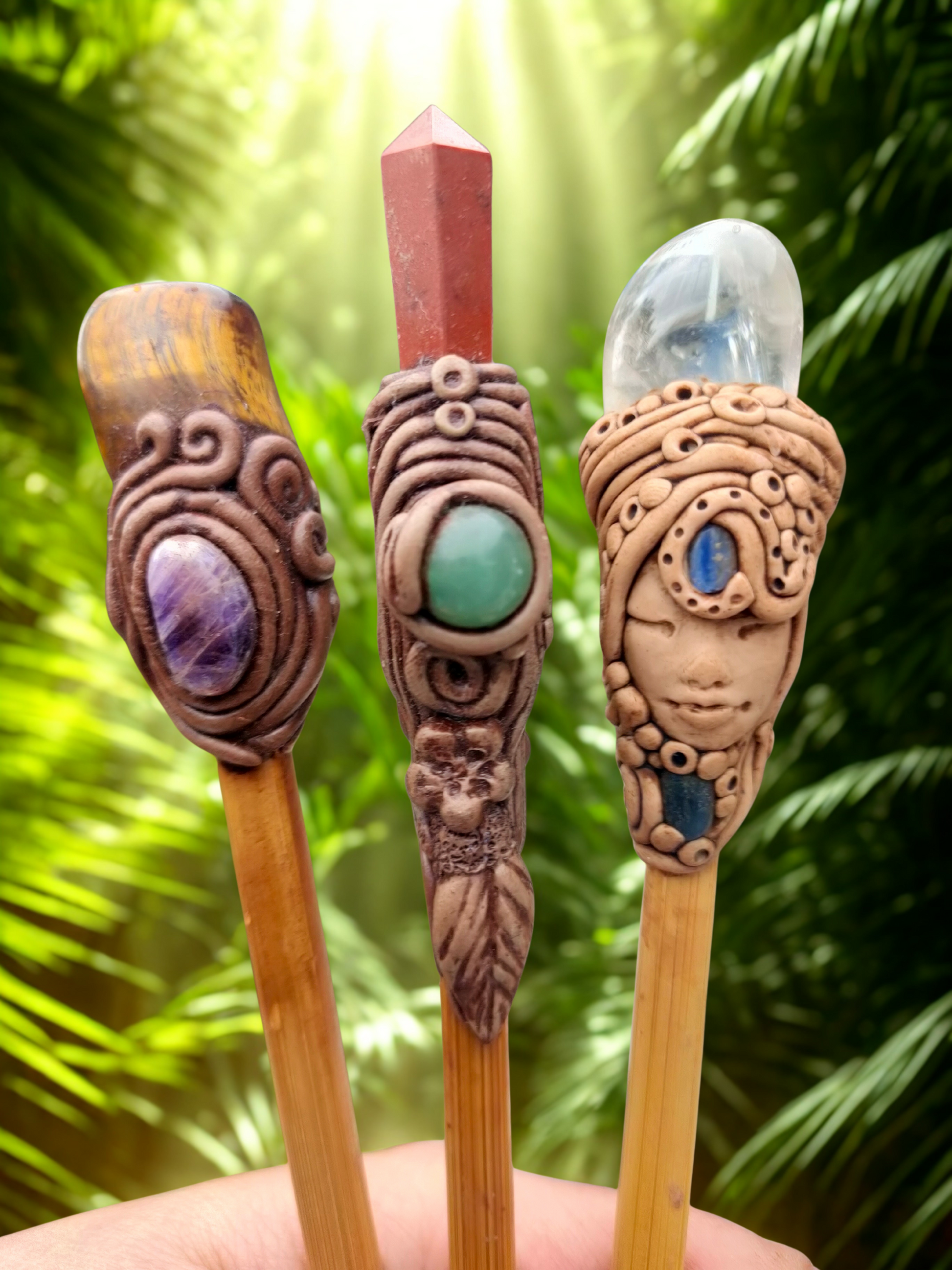 Designed to hold your hair securely while radiating your chosen stone’s energy, they’re as practical as they are enchanting. Whether you're dressing up a bun, a twist, or simply adorning your locks with intention, these sticks bring a grounded, boho elegance to everyday styling.